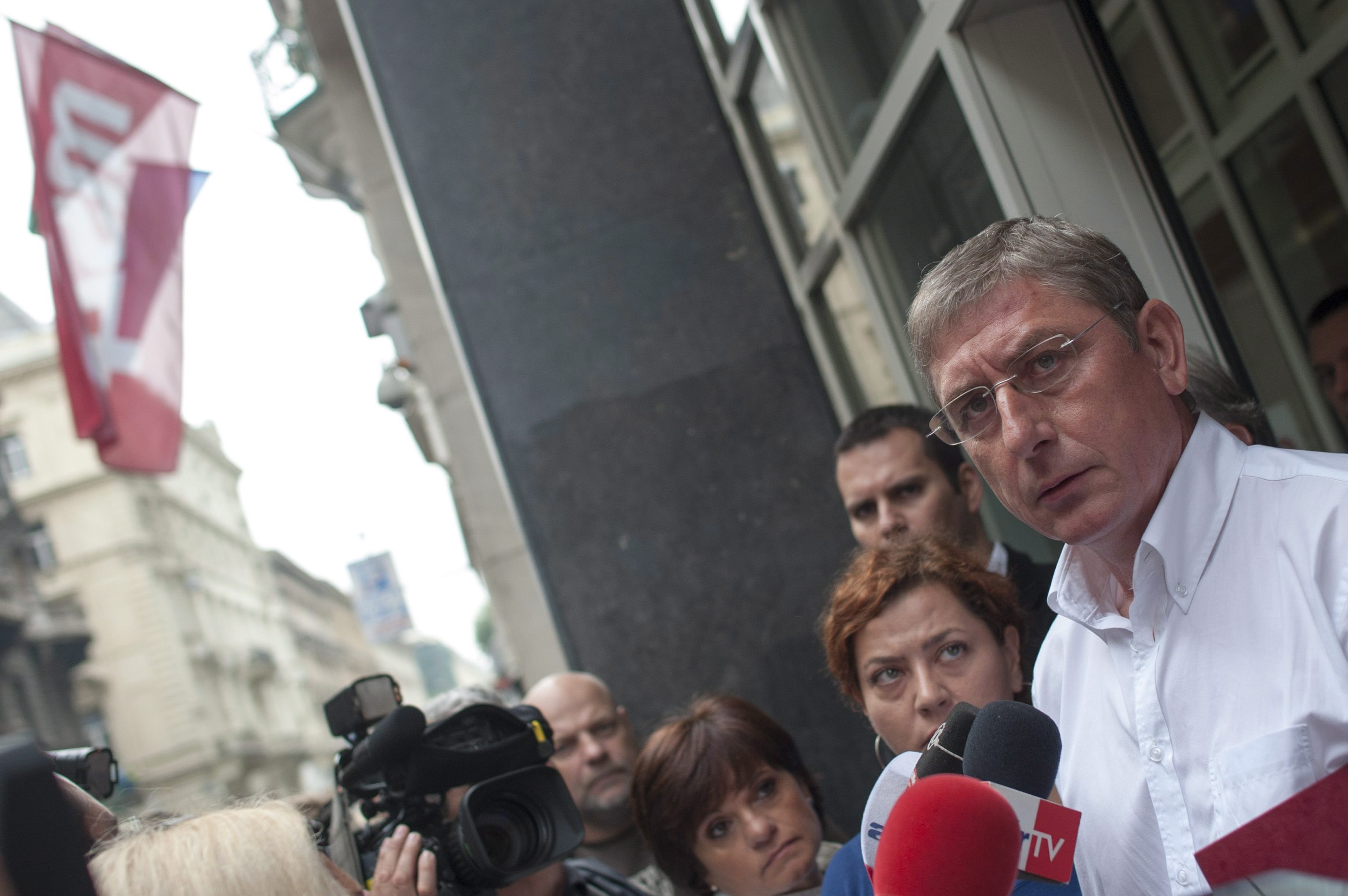 Budapest, 2013. szeptember 10. Gyurcsány Ferenc, a Demokratikus Koalíció (DK) elnöke (j) nyilatkozik az MSZP-vel történt tárgyalás után, a szocialisták Jókai utcai székháza előtt 2013. szeptember 10-én. Mellette a DK tagjai, Vadai Ágnes (j2) és Molnár Csaba. Eredménytelenül zárultak le a két párt tárgyalásai, a DK önállóan készül a választásokra. MTI Fotó: Marjai János